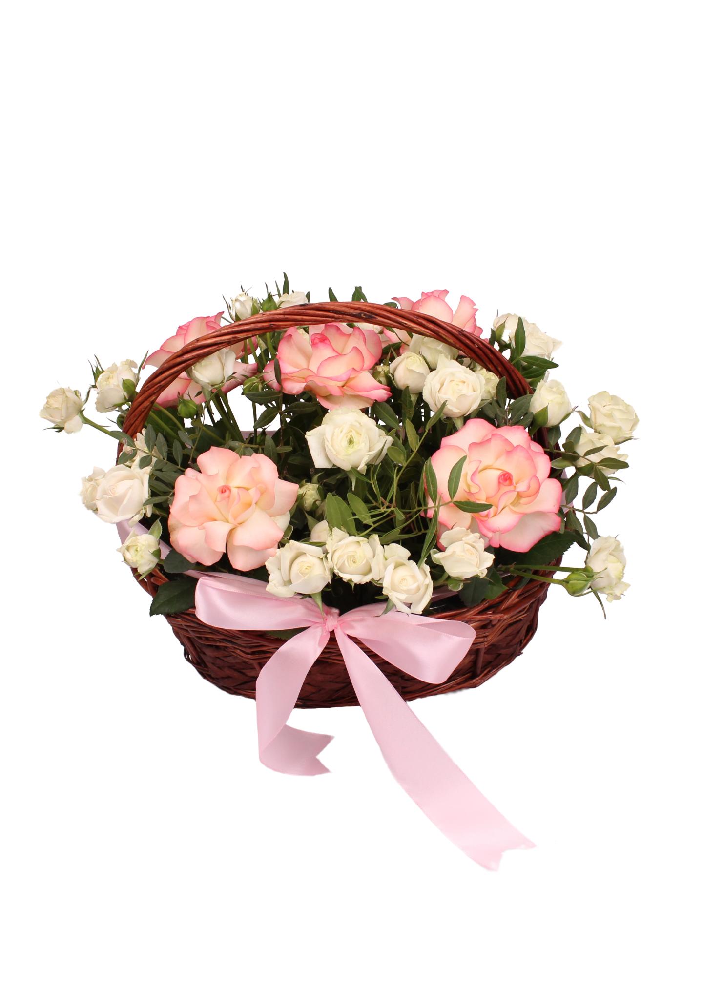 Состав букета: - Роза "Джумилия" 40 см - 5 шт - Роза кустовая "Эксклюзив Сенсейшен" - 10 шт. - Корзина - Оазис - Лента